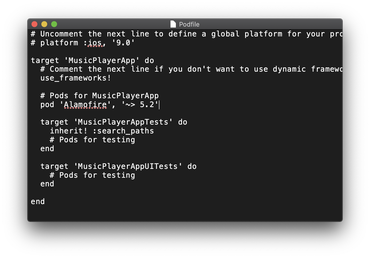 4. podfile에 프로젝트에 추가하고싶은 pod을 입력하고 저장해준다. 이번에는 Alamofire를 입력해 봅시다. 이 때 다른 pod을 설치하고 싶다면 이곳에 라인을 추가해주면 됩니다.
