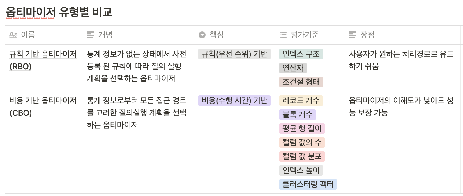 SQL을 가장 빠르고 효율적으로 수행할 최적의 처리경로를 생성해주는 DBMS 내부의 핵심엔진
