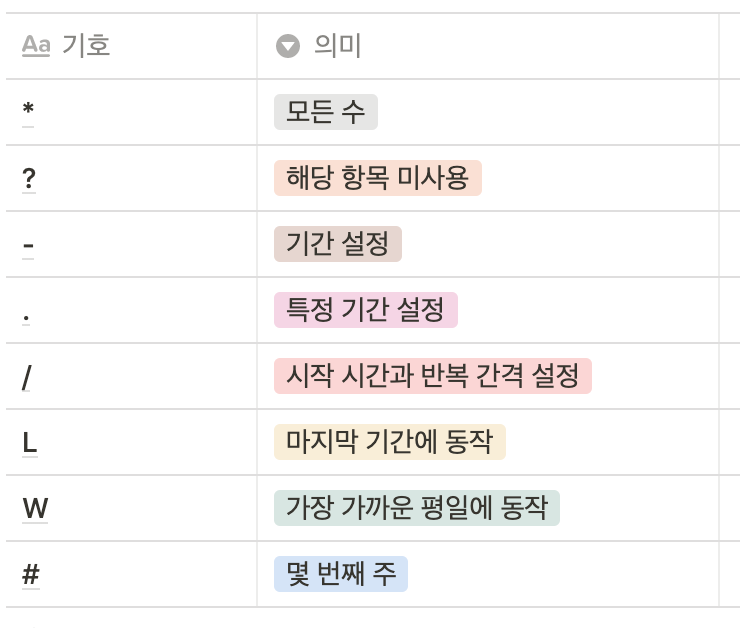 - 0 * 13 * * * : 매일 14시에 0 ~ 59분까지 매 분 실행