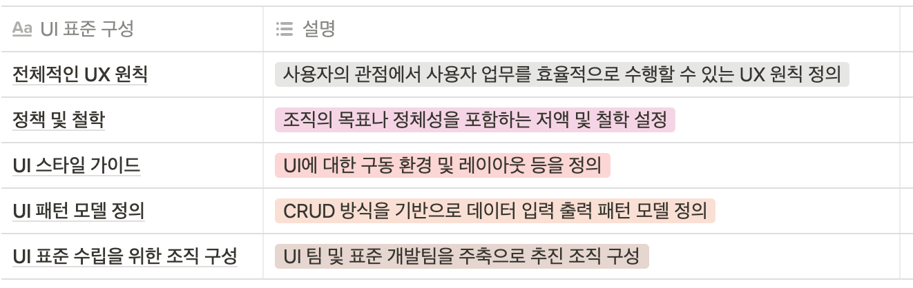 UI 표준은 디자인 철학과 원칙 기반하에 전체 시스템에 공통으로 적용되는 화면 간 이동, 화면 구성등에 관한 규약