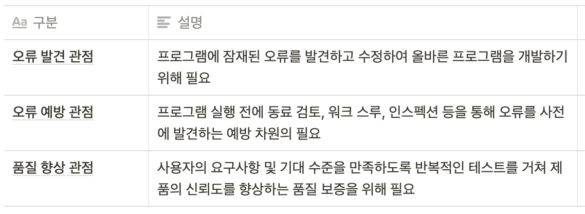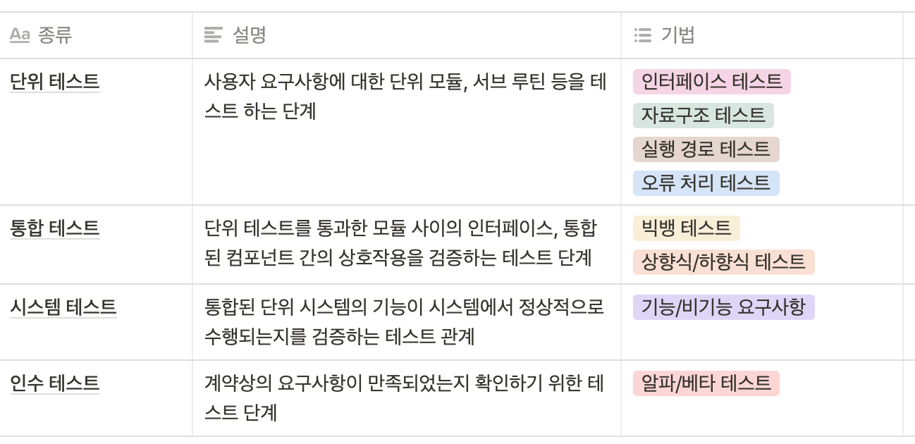 - 안전 테스트 : 불법적 소프트웨어가 접근하여 시스템 파괴하지 못하도록 소스 코드 내의 보안적 결함 미리 점검하는 테스트