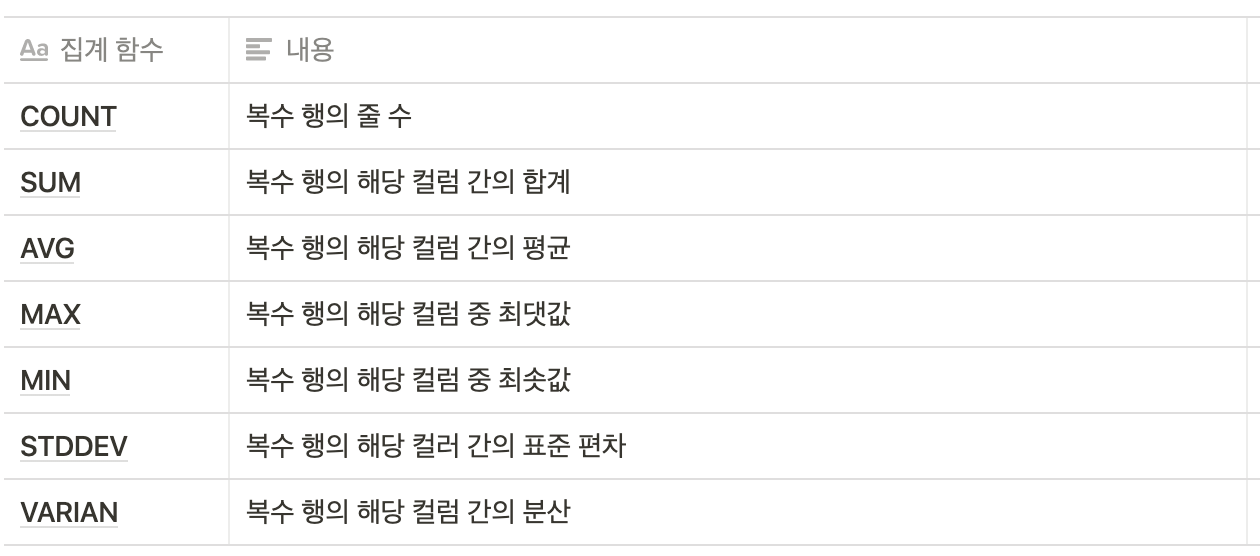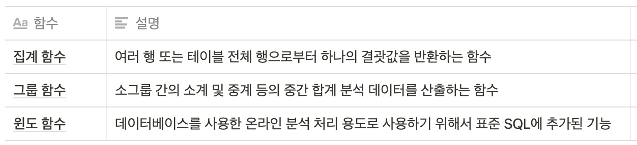 여러 행 또는 테이블 전체 행으로부터 하나의 결괏값을 반환하는 함수