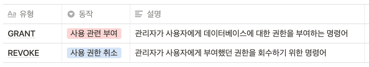 GRANT 권한 ON 테이블 TO 사용자 [WITH 권한 옵션];