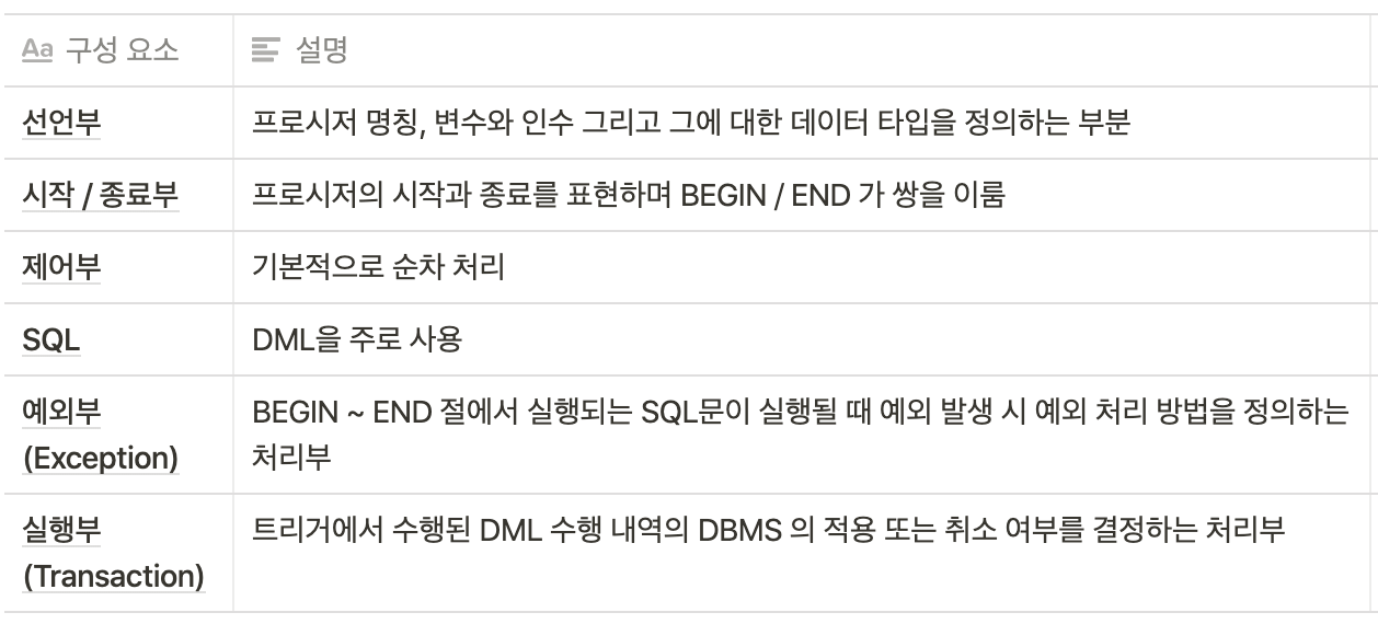 - 외부 변수 IN / OUT이 없다는 점은 프로시저나 사용자 정의함수와 다르다.